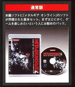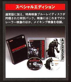 C'est une journée forte en infos sur Metal Gear Solid 4 ! Pourvu que ça dure, comme dirait l'autre... Le magazine nippon Famitsu lâche en effet l'info qui tue, dans sa dernière édition : MGS 4 sera donc disponible très exactement le 12 juin 2008 au Japon, et une fois dans la boutique du coin, les joueurs pourront se procurer, au choix, trois versions : une classique (le jeu et son pendant multi Metal Gear Online), une "Special Edition" (avec en plus un Blu-ray bourré de trailers et de bonus en tout genre, le tout dans un box noir classieux), et enfin un "Premium Pack", qui comprendra en plus un Dual Shock 3 et une Playstation 3 d'une nouvelle couleur, spécialement créée pour l'occasion, et qui sera dévoilée le 21 mars prochain.