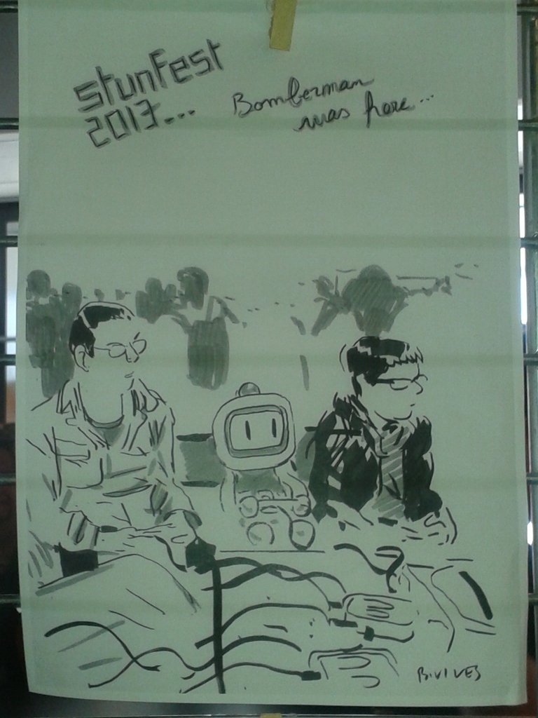 Les couloirs sont gorgés de monde. Pas mal de types avec des sticks arcades sous les bras. Quelques dessins de Bastiens Vivès - entre autres - sont exposés.