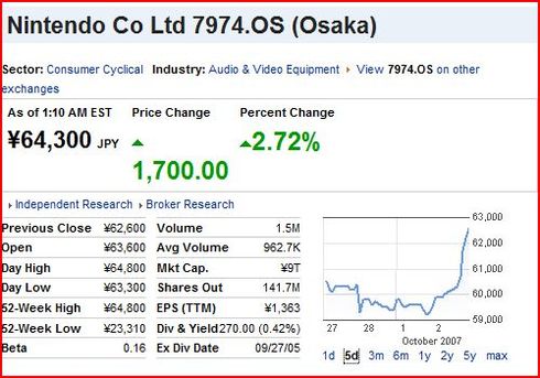 C'est hier, mercredi 3 octobre de l'an de grâce 2007, que Nintendo a creuvé le plafond de sa propre cotation à la bourse de Tokyo, en atteignant son high score historique, à 64.800 Yens durant la séance. Redescendu à la fin de celle-ci à 64.300 Yens, l'action du géant nippon de l'entertainment de loisirs futiles a tout de même progressé de 2.72%. La veille, la décision d'envoyer 17 millions d'étuis de Wiimote aux joueurs du monde entier, ainsi que les récentes prévisions à la hausse de Goldman & Sachs pour les ventes de fin d'année, ont boosté l'ensemble du bouzin. Comme quoi, faire des consoles "simples" et pas chères...