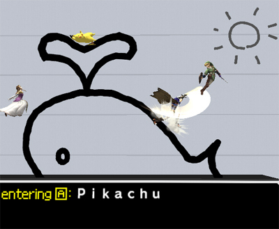 Sur le site officiel de Super Smash Bros. Brawl, la mise à jour du... jour, nous dévoile un stage ma foi fort rigolo, inspiré du PictoChat de la DS (le truc qui sert à s'envoyer en Wi-Fi des dessins en général très inspirés). L'écran sera au départ vide de tout gribouillage, puis ces derniers apparaîtront progressivement, au fil du combat. Bien sûr, les personnages pourront ensuite interagir avec le décor créé (en grimpant dessus notamment), mais aussi en subir les quelques effets (vent, flammes...). On apprend également que, parmi les différentes musiques proposées dans ce stage, on pourra écouter, en plus du thème PictoChat, les magnifiques morceaux issus de différentes chaînes Wii Channel. Allez, je vous laisse avec les photos (légendées pour certaines par notre maître à tous, Laurent Ruquier).
