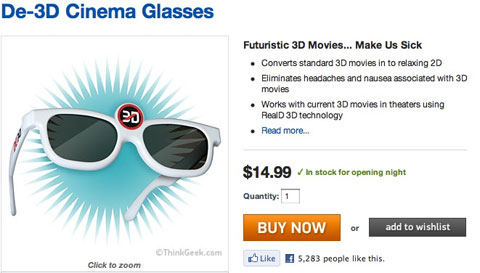 Pour moi, c'est ThinkGeek qui aura eu la meilleure idée d'objet malheureusement pas réel : les lunettes pour dé-3D-iser les films.