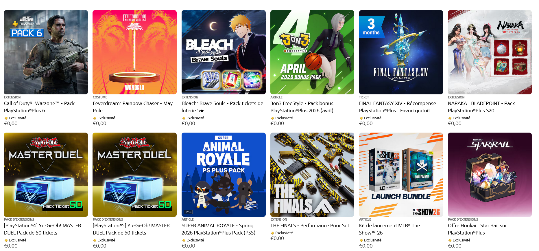- Bleach: Brave Souls - Pack tickets de loterie 5★ : ce pack gratuit pour les membres PS Plus inclut un ticket de loterie personnage 5 étoiles, un ticket de loterie à accessoires, ainsi que 50 Soul Tickets. Vous avez jusqu'au 1er mai 2026 pour le récupérer.