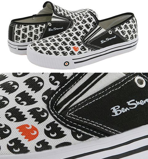 Bref, la marque de fringues Ben Sherman, réputée pour habiller la racaille blanche anglaise depuis les années 60, s'est laissée aller à piquer un modèle de basket chez Van's et à l'orner des célèbres fantômes de Pac Man. Les mauvais esprits relèveront un hommage non innocent au Roi des Gobeurs, les autres apprécieront les détails apportés au soulier Blinky Shoes, tels la cocarde stratégiquement placée et bien sûr l'unique fantôme coloré.