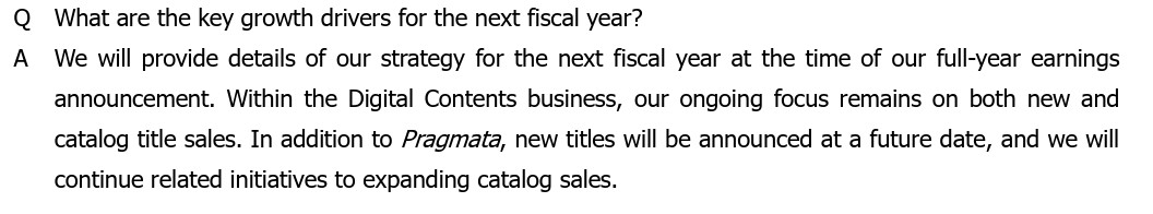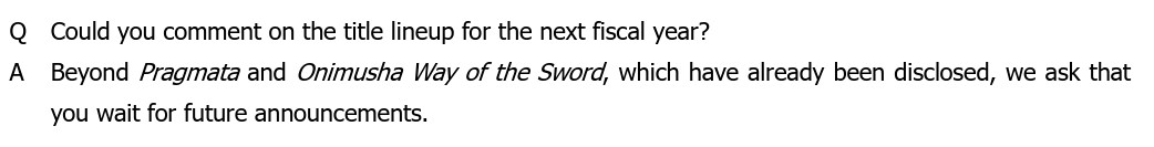 Lorsqu'il est demandé à Capcom ce qui devrait être un levier de croissance pour la prochaine année fiscale, Capcom répond qu'il fournira davantage de détails lors du bilan annuel, avant de préciser qu'en plus de Pragmata, « de nouveaux jeux seront annoncés ultérieurement ». Plus tard, ce sont carrément les plans pour l'année qui sont demandés, ce à quoi Capcom répond une nouvelle fois que des annonces seront faites prochainement. C'est là que tout le monde espère qu'il s'agisse bien d'un remake de Resident Evil.