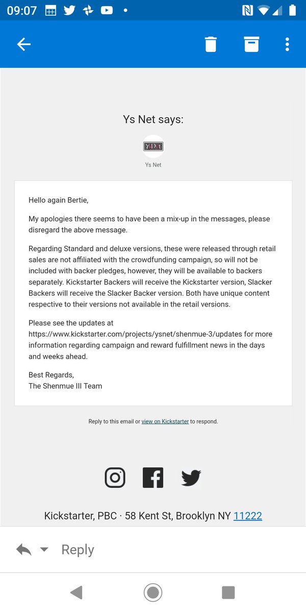 Pour se justifier, le studio de Yu Suzuki explique que la production des versions de Shenmue III vendues dans le commerce est faite indépendamment de celle des versions liées à la campagne de financement participatif. D'après Ys Net, les versions "retail," "Kickstarter" et "Slacker Backer" de Shenmue III sont toutes différentes. Et il précise à ce propos que ces deux dernières disposeront de contenus absents de la version vendue dans le commerce. Ys Net n'a cependant pas précisé la teneur de ce contenu exclusif.
