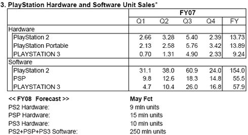 Pour les ventes de consoles, Sony annonce avoir écoulé dans le monde 9,24 millions de PS3, 13,89 PSP et 13,73 PS2. Pour le software, c'est 154 millions de jeux sur PS2, 55 millions sur PSP et 58 millions sur PS3. Voir le tableau ci-dessous, par trimestre et par machine.