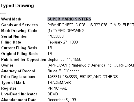 Bon, rien de bien transcendant à vous annoncer ici-même, mais cette petite trouvaille est assez rigolote, si l'on veut bien se donner la peine d'ouvrir ses cages à miel. Vous savez tous que les sociétés passent leur temps à déposer des noms, quel que soit le domaine. Ca en devient même pathologique parfois. Ainsi, moi-même je... euh ok. Dans les jeux vidéo, c'est tout pareil. Or, donc le 27 février 1990 précisément, Nintendo a enregistré le nom "Super Mario Sisters", auprès de l'organisme compétent en la matière. Avant de le retirer le 5 décembre 1991.