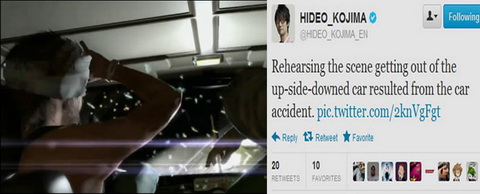 En repartant dans le passé et en se remémorant certains propos de Kojima, il est possible de trouver quelques indices. Quelques uns paraissent plus évidents que d'autres. Ainsi dans le trailer, vous n'avez pas pu louper la séquence de l'accident de voiture ! Le véhicule se retourne, panique à bord. Eh bien en juin dernier, voici ce que Hideo Kojima tweetait : "Répétition de la scène de la sortie de la voiture renversée à cause de l'accident de voiture."