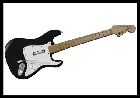 La guitare de Rock Band apparaît enfin aux yeux des geeks fanas de riffs virtuels par l'intermédiaire de la dernière newsletter de GameStop. Basée sur la célèbre Fender Stratocaster, on y trouve pas moins de 10 boutons, répartis en deux groupes de 5 sur le manche, probablement pour les solos, tandis que la newsletter mentionne également la possibilité de manipuler le son par l'intermédiaire de divers effets, reverb, wah wah et compagnie. Reste à attendre patiemment pour ce qui va peut-être ruiner les maigres espoirs qu'a Angel de séduire à la force de ses talents musicaux imaginaires : le prix de l'accessoire.