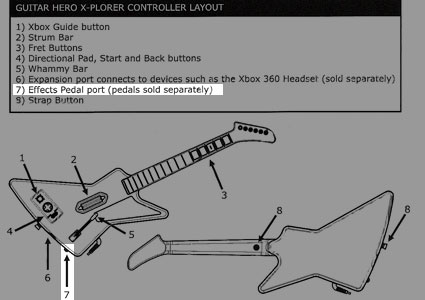 C'est grâce à nos confrères bushistes de Joystiq.com que nous avons appris qu'une pédale d'effet était prévue pour la fausse guitare de la Xbox360 servant à incinérer ses adversaires avec des solos bien sentis sur le très ludique Guitar Hero II. L'information est venue tout simplement du manuel du jeu, qui dévoile en toute indolence un branchement de base, ainsi que la nature de l'extension.