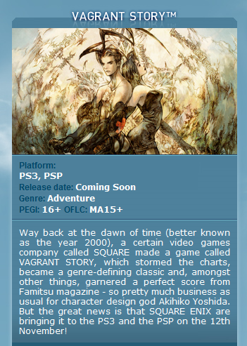 Si aucune confirmation officielle n'a eu lieu pour l'instant, il semble que Vagrant Story, hit RPG mésestimé de Squaresoft sur PlayStation, soit en route pour le PlayStation Network. Il y a d'abord eu un Tweet de Mike Kebby, de Sony Computer Entertainment Europe, manager de la boutique en ligne, abordant une sortie spéciale cette semaine.