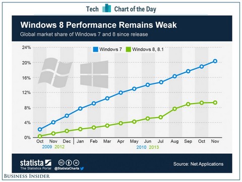 Ainsi, après cette année et malgré une version intermédiaire (Windows 8.1) le système d'exploitation n'aurait toujours pas dépassé le seuil des 10% et stagne depuis septembre maintenant.