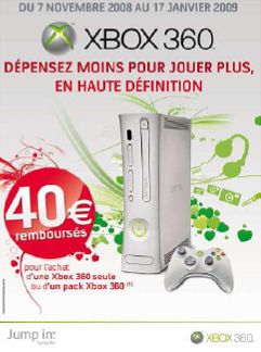 C'est à partir de ce vendredi 7 novembre (et jusqu'au 17 janvier 2008) que Microsoft lance sa "grosse" offensive de fin d'année. Outre les réductions de prix de ses trois versions de Xbox 360, déjà annoncées précédemment, le géant américain va lancer des offres alléchantes en terme d'achat d'accessoires (jusqu'au 31 décembre) et de jeux notamment. En effet, pour tout achat d'une console Xbox 360 seule ou d'un quelconque bundle (Arcade, Premium ou Elite), le constructeur vous rembourse 40€ sur simple demande, ce qui ramène le modèle Arcade à... 139 euros ! Il vous faudra simplement retourner ce coupon-réponse (PDF), accompagné de la preuve d'achat (code barre + ticket de caisse), et d'un RIB. A noter que les packs Gears of War II, Quantum of Solace, Prince ou Persia et Tomb Raider Underworld sont AUSSI concernés.