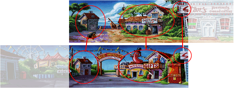 Le fameux Secret de l'Île aux singes... Ron Gilbert, le créateur de la série et des deux premiers épisodes, n'a jamais voulu révéler le fin mot de l'histoire, mais la fin de Monkey Island 2 reste troublante à plus d'un titre pour les fans. En effet, dans le parc d'attractions de Big Whoop, la ressemblance avec l'Île de Booty est plus que troublante (voir la photo ci-dessous).