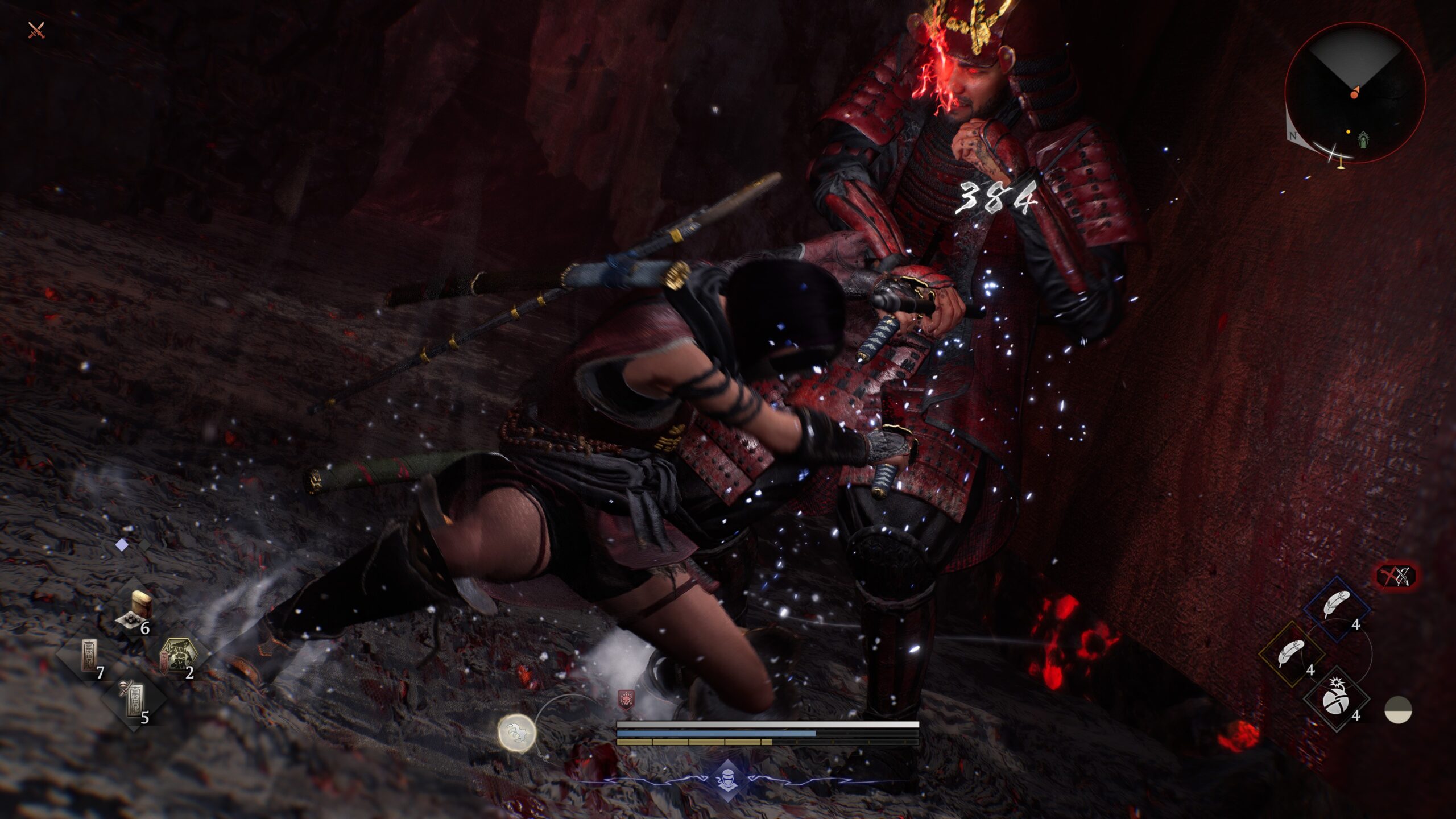 La véritable nouveauté se trouve plutôt du côté ninja, qui en ferait pâlir Ninja Gaiden. Ultra-vive, pour ne pas dire frénétique, cette classe est taillée pour faire des ravages rapidement et utiliser des objets ou des compétences de ninjutsu. En revanche, le moindre choc reçu peut être mortel et tout le gameplay réside sur la bonne gestion de l'endurance et des esquives uniquement. Deux facettes du gameplay définitivement différentes et complémentaires à la fois. Si certains vont vouloir se concentrer sur une seule de ces formes, ce serait se priver de la véritable profondeur du gameplay, qui nous pousse au contraire à jongler entre les deux constamment.