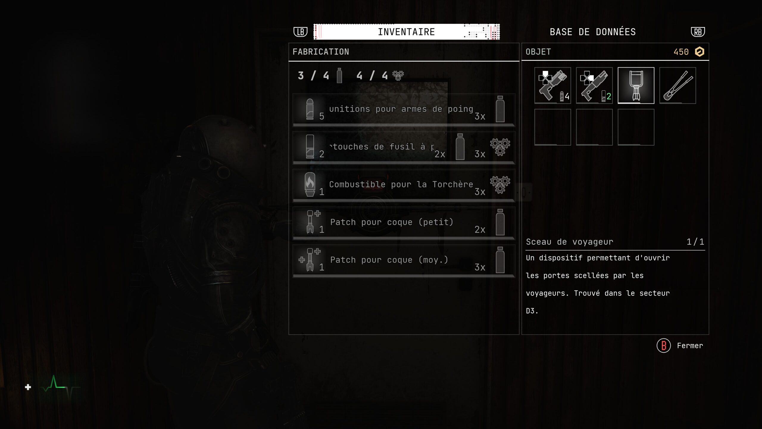 Comme si cela ne suffisait pas, le jeu est avare en objets et en place dans l’inventaire. Il va falloir sacrément batailler pour avoir toujours ce qu’il faut en ressources sous la main et faire des choix. Certains objets, comme les munitions de pistolet et les injecteurs de soin, partagent les mêmes matériaux, rendant la fabrication en masse impossible. De même, on sera limité à une infime quantité d’objets identiques (moins de 5 cartouches de fusil à pompe pour commencer, par exemple), pareil pour les ingrédients indispensables pour fabriquer ce dont on a besoin. En clair, on est clairement affamé et, lorsqu’on a enfin plein d’objets sous la main, c’est notre inventaire qui n’a pas assez d’espace pour tout stocker. Il y a ici moins d’une dizaine d’emplacements de dispo lorsqu’on commence le jeu et TOUT prend de la place : armes, munitions, soins, trésors à revendre et même les objets-clés. Vous devrez donc faire sans cesse des choix et manager votre barda.