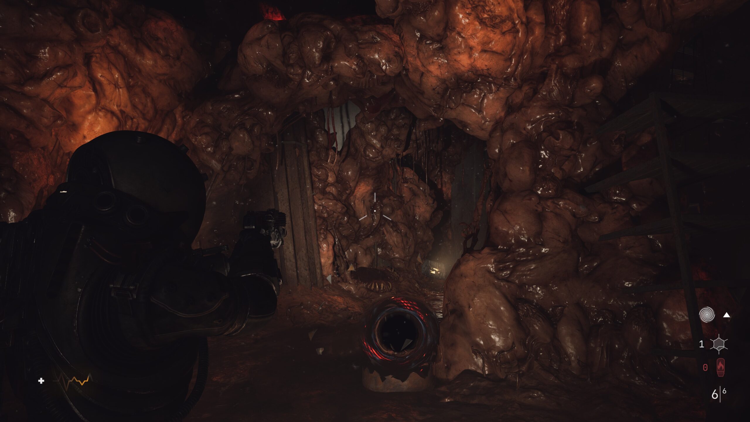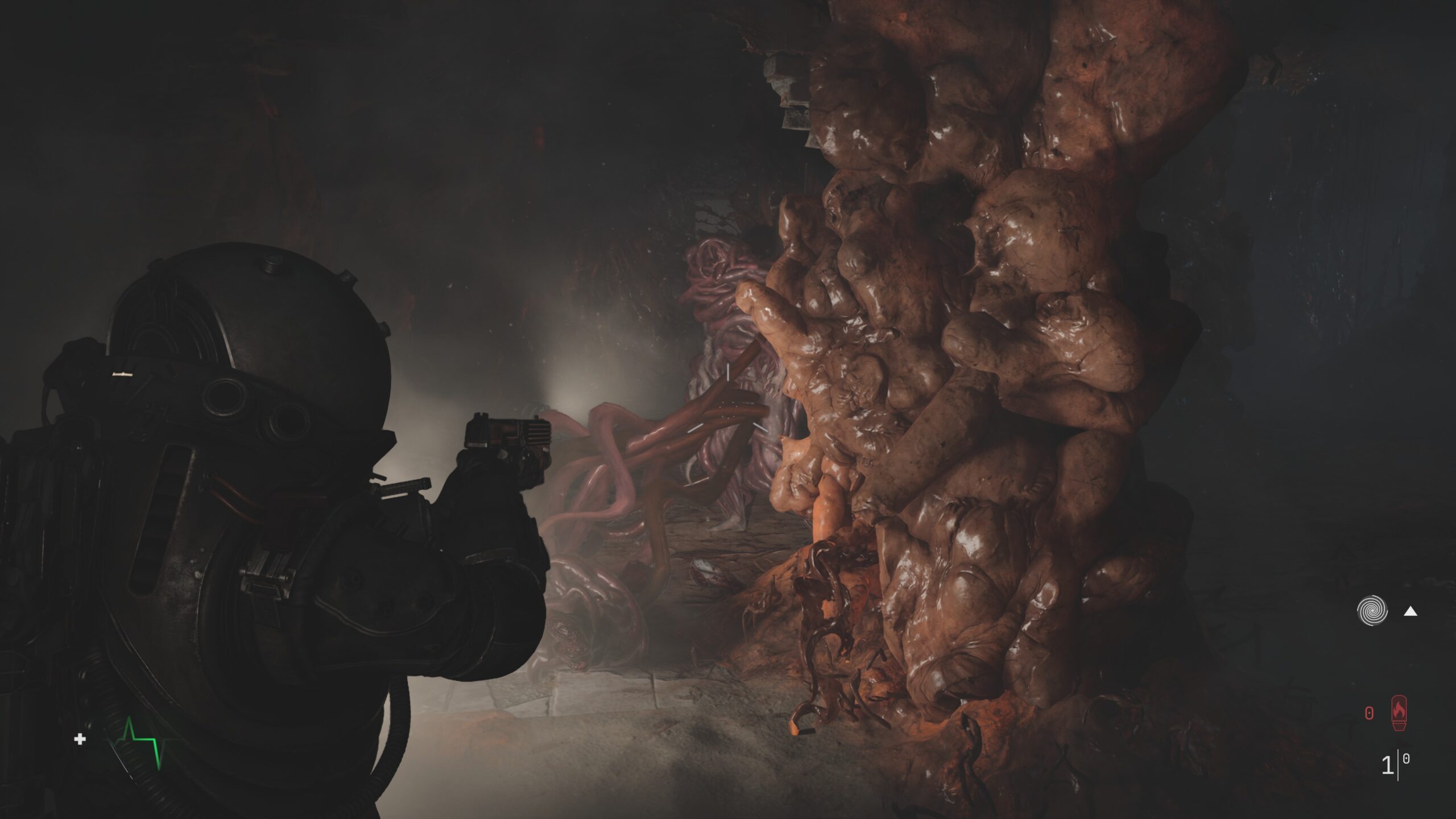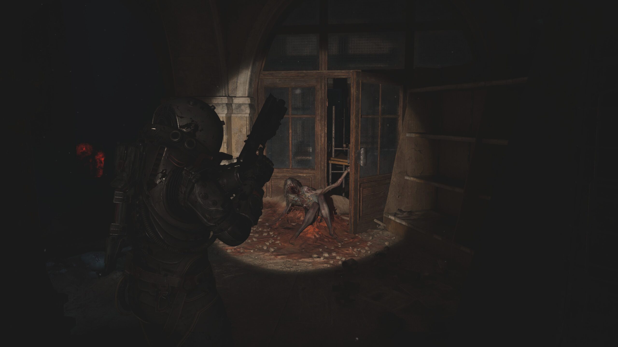 Bloober Team renoue avec le survival horror à l’ancienne, mais vraiment à l’ancienne. L’époque où l’on devait mémoriser notre cheminement, où chaque objet était essentiel et où l’on devait systématiquement faire de la place dans son inventaire. Notre Voyageuse a beau porter une armure de 40 kilos et se déplacer comme un tank, elle n’en reste pas moins fragile et sous-équipée. Moins de dix emplacements dans l’inventaire, une barre de vie qui s’envole à vitesse grand V, des mouvements réduits et une caméra serrée à l’épaule… on craint vraiment pour notre peau. Il est certain que ces choix seront contestés et vont grandement diviser. Il n’y a pas de mini-map ni même de carte des environnements que l’on visitera. Et si le jeu se passe souvent dans des lieux étriqués, on devra parfois faire des allers-retours, sans compter qu’il fait presque noir tout le temps ou que le brouillard sera présent. En d’autres termes, c’est parfois difficile de se repérer, surtout que tout est souvent déstructuré ou couvert de substances étranges autour de nous.