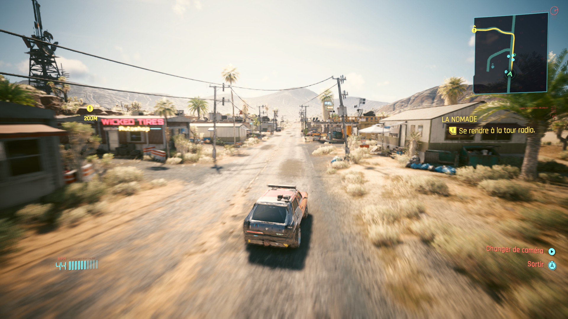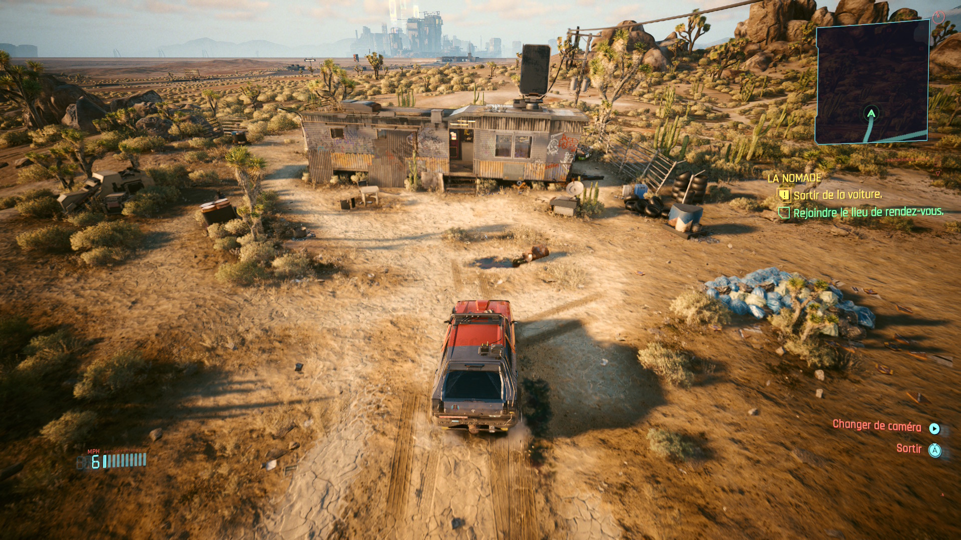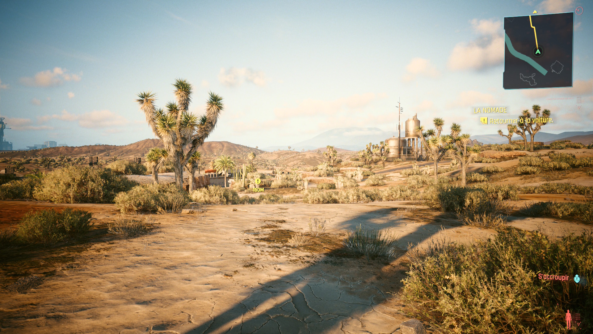Avec la première option, le jeu est évidemment plus fin, mais on voit aussi plus facilement les soucis graphiques. Le flou apparaît plus prononcé en arrière plan, l’aliasing est clairement visible et quand bien même la résolution tente de tenir le tout à bout de bras, ce n’est pas très beau. Disons que c’est passable, on saluera surtout l'effort de la petite Switch 2 d'encaisser tout ça. Heureusement, c’est plutôt fluide, largement suffisant pour pouvoir jouer convenablement, si l’on accepte de faire de gros sacrifices visuels. En version nomade, ça reste là aussi convenable, bien qu’en dessous de toutes les espérances. Mais Cyberpunk 2077 est jouable, les problèmes d’aliasing sont moins perceptibles (taille d'écran réduite oblige) et l’on souffre moins du flou lorsque la distance d'affichage tente de nous afficher des panoramas ou l’horizon dans le désert notamment.