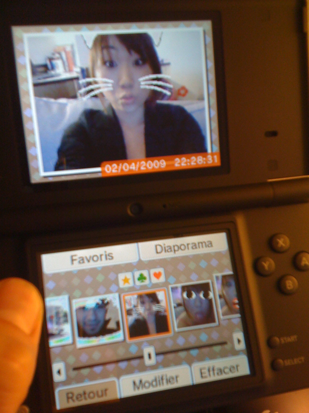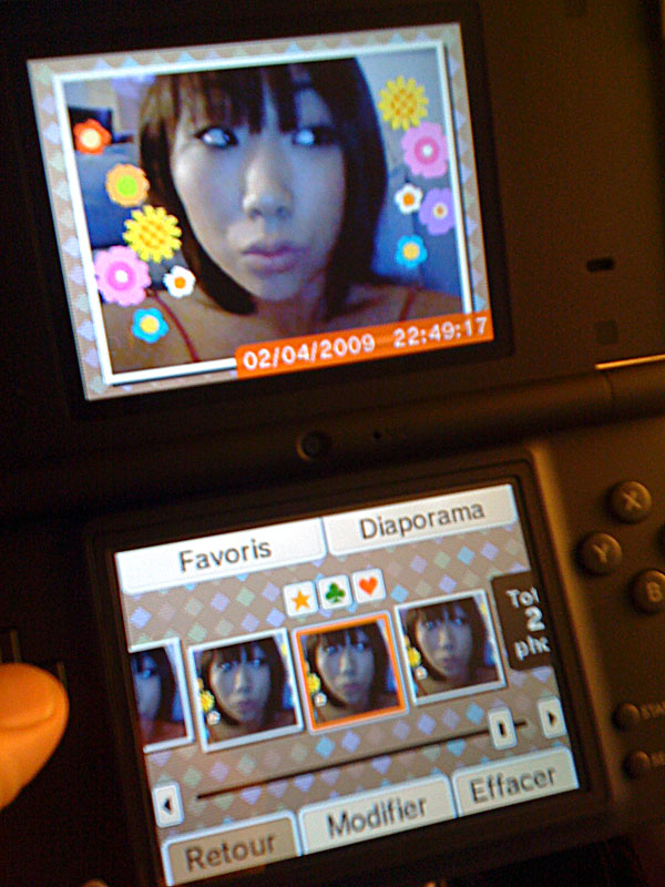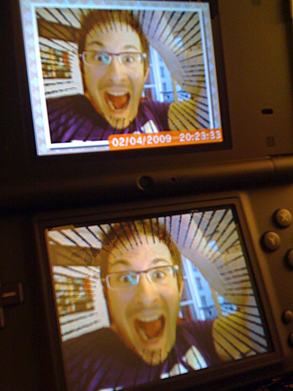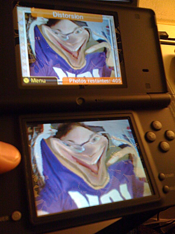 Si la partie sonore se révèle gentillement gadget, la zone de retouche photo risque d'en captiver plus d'un. Déformer les visages, ajouter mille et un filtre à la mords-moi-le-noeud a souvent suscité une certaine fascination chez les gens. Et les joueurs n'y font pas exception. D'autant qu'en s'appliquant un peu, il est effectivement possible de réaliser des petites créations bien débiles. Le vrai regret reste la piètre qualité des capteurs photos (seulement 300.000 pixels soit près de 7 fois moins que n'importe quel appareil photo de téléphone portable !). Le résultat se montre donc assez granuleux, avec une colorimétrie complètement inadaptée pour les clichés d'intérieur. N'espérez pas imprimer le tout ou en faire un fond d'écran d'ordi. Quoiqu'il en soit, il existe 10 filtres différents pour laisser s'exprimer toute sa puissance créatrice... ou pas. D'ailleurs vous trouverez ci-dessous quelques exemples cosmico-débiles de ce qu'il est possible de faire :