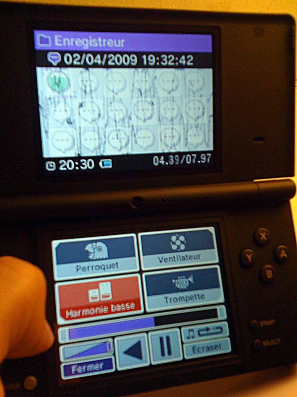 C'est une perruche chantante qui vous accueille ici. Le but : jouer avec le son, qu'il s'agisse des phrases enregistrées par vos soins ou de musiques en provenance de votre carte SD. Pour vos sons, il est possible d'enregistrer 18 échantillons de 10 secondes maximum. Ensuite, à vous de modifier le tout de différentes manières. Plusieurs effets s'offrent alors à vous. Ralentir ou accélérer drastiquement le son, et en changer le pitch (plus aigu, plus grave). Quatre effets automatisés sont aussi là : la voix perroquet (voix de crécelle), la tonalité ventillateur (hache la voix), l'harmonie basse (en mode Dark Vador) et la trompette (euh vous parlez comme une trompette). Prédisons un futur carton chez les plus jeunes... et un prochain pétage de câble chez les parents ! Attention cependant, la DSi ne lisant pas les MP3 (!!!), vous ne pourrez pas vous amuser à jouer avec les podcasts de Gameblog par exemple. Pour y arriver ou utiliser des musiques, il faudra au préalable convertir le tout en format AAC. Fastidieux.