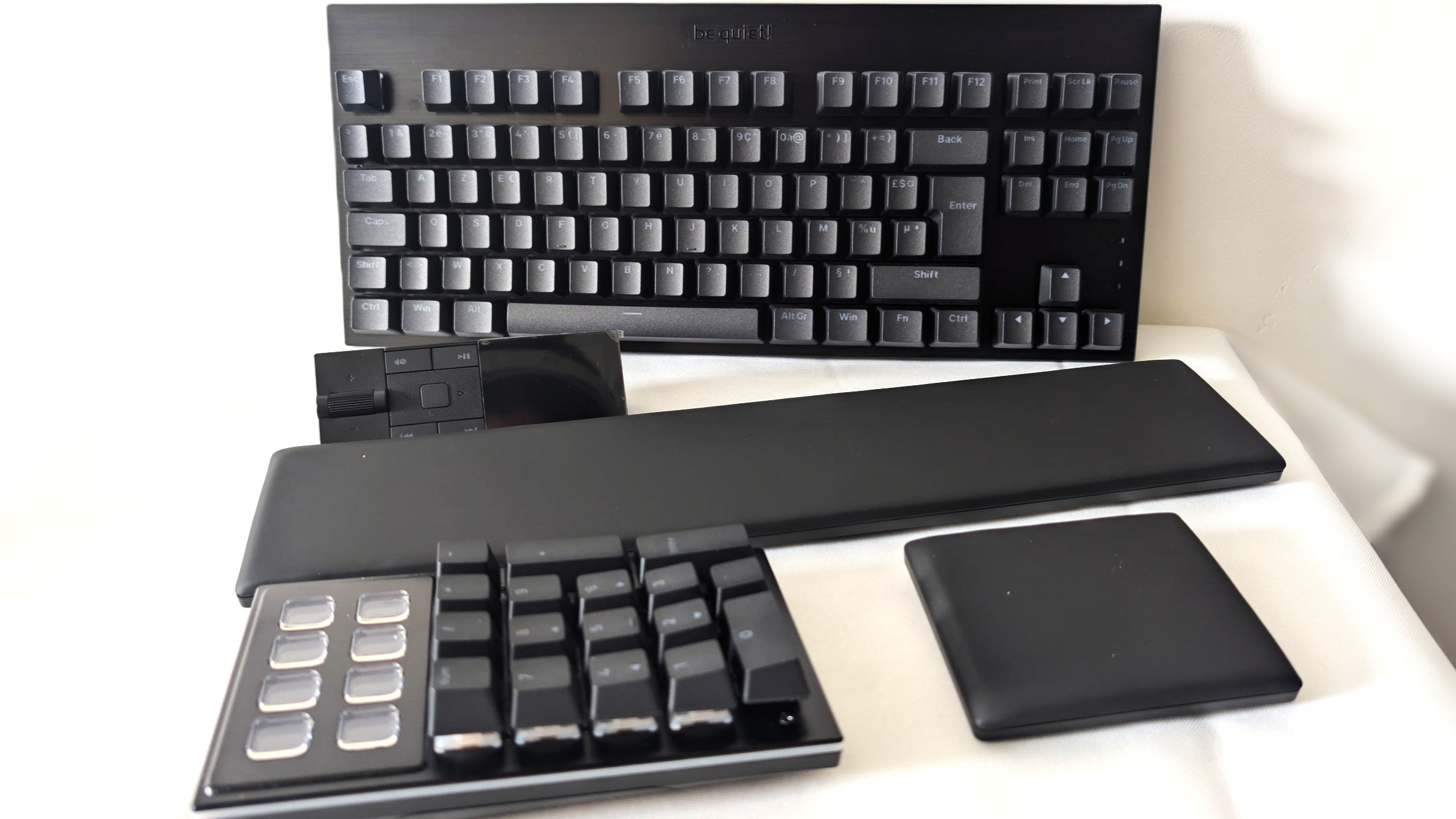 Le Dark Mount est fourni avec un câble USB-C tressé et renforcé pour se connecter au PC, ainsi que plusieurs patins et une pince pour retirer les capuchons et les switchs au besoin. Un kit tout équipé en somme. À cela s’ajoutent aussi deux repose-poignets d’excellente facture. L’un se cale sur le clavier principal, l’autre sous le pavé numérique. Là encore tout est aimanté, c’est résistant et facile à monter ou démonter. Notons que le revêtement des repose-poignets est d’une douceur assez surprenante, clairement nos mains sont très à l’aise.