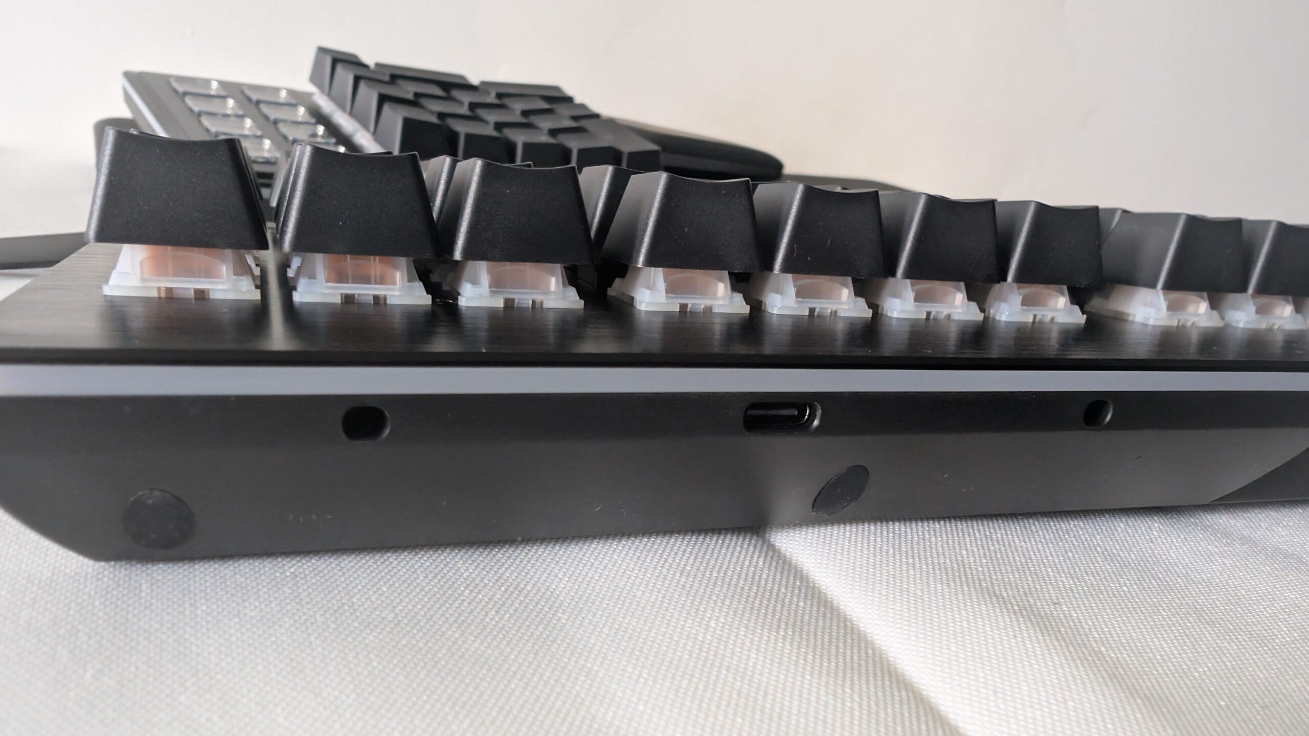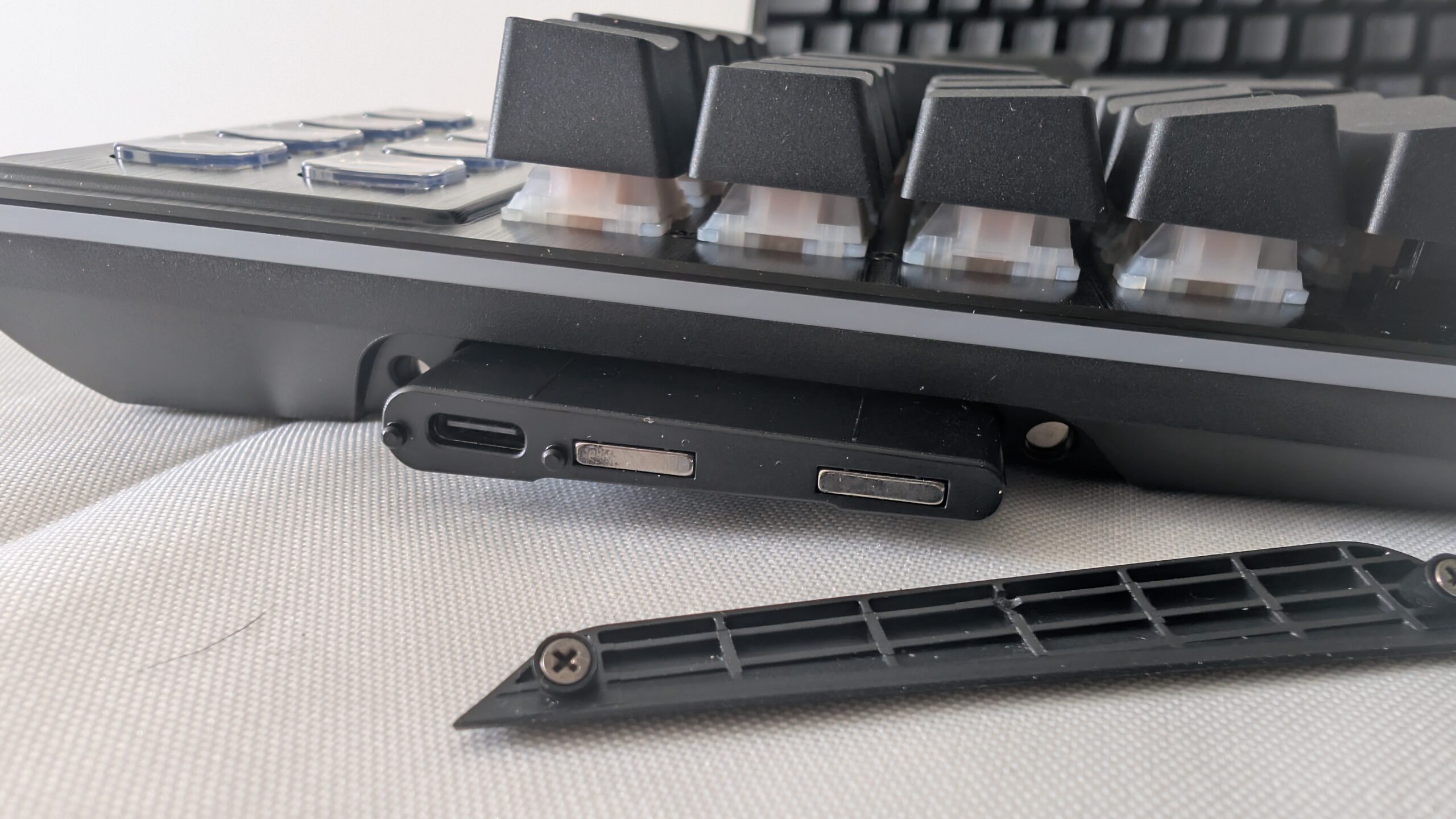 Ce dernier est justement l’un des éléments détachables qui pourront venir se placer sur le flanc droit ou gauche selon vos envies. D’ailleurs, le montage, et le démontage, se font en un rien de temps. Les encoches sont clairement visibles, bien que remarquablement bien masquées par de petites plaques aimantées pour ne pas faire disgracieuses, et un petit bouton-poussoir sous le pavé numérique qui servira à faire sortir la prise USB-C d’un côté ou de l’autre. C’est avec ce branchement que l’on viendra l'associer au bloc central du clavier.