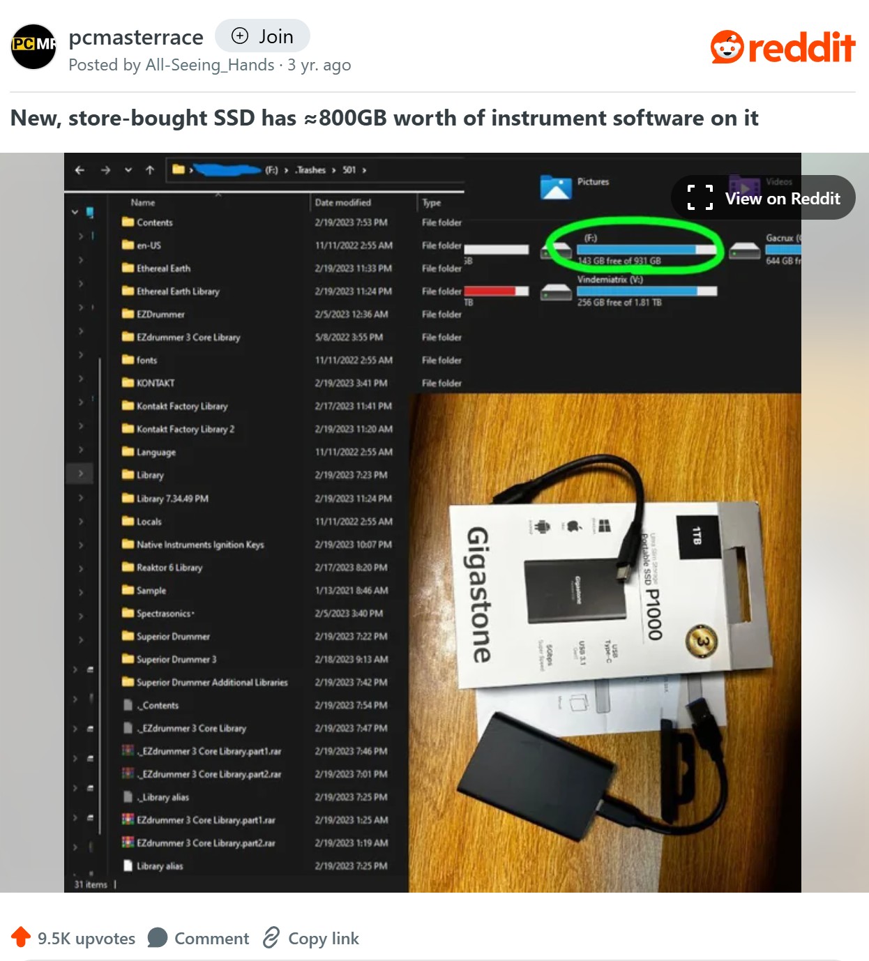 L’histoire a été racontée sur Reddit par un utilisateur nommé All-Seeing_Hands. Après avoir branché son SSD de 1 To, censé être vide, il a découvert qu’il contenait déjà un gigantesque dossier. Dedans, des programmes bien connus du milieu musical, comme Kontakt (peut monter à 1000 dollars selon la version) ou encore Reaktor (près de 200 $). De quoi se demander d’où venait réellement ce matériel censé être neuf.